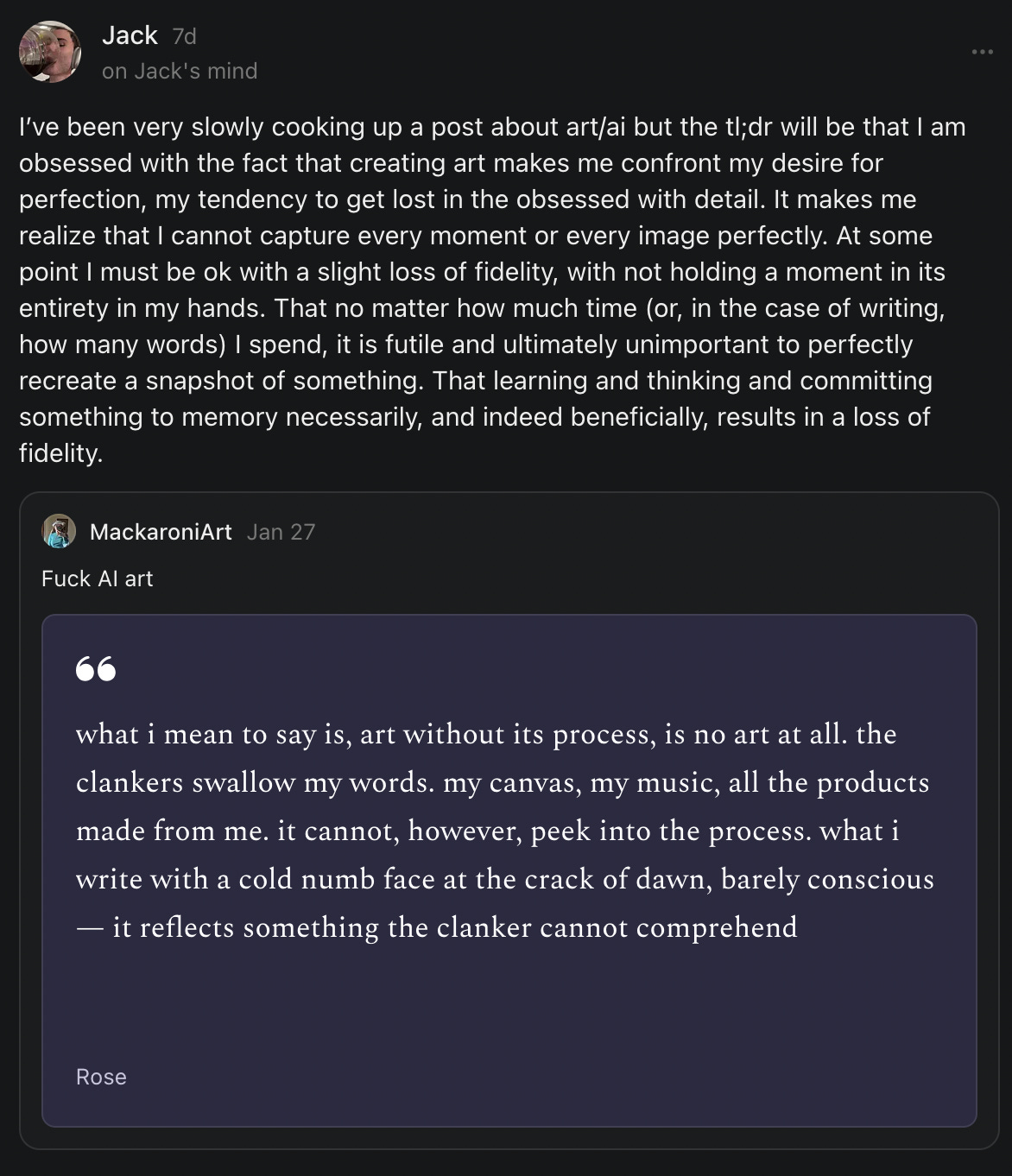 I was planning to write this after I’d actually finished the painting, but after I saw emma 🐞⋆˚꩜’s post earlier I decided I might as well write it now before I lost track of my yellow notepad with the outline. And besides, I am out of one of the paint colors I need and I have several other projects going on, so it might be a while. You should absolutely read her post (and subscribe to Bramble House) if you haven’t, as it neatly lays out many aspects of what art is, how art relates to humanness, and why AI fails to become an artist—all supported with quotations. This short piece will, by contrast, be a journey through my internal process as I work on a the aforementioned painting.