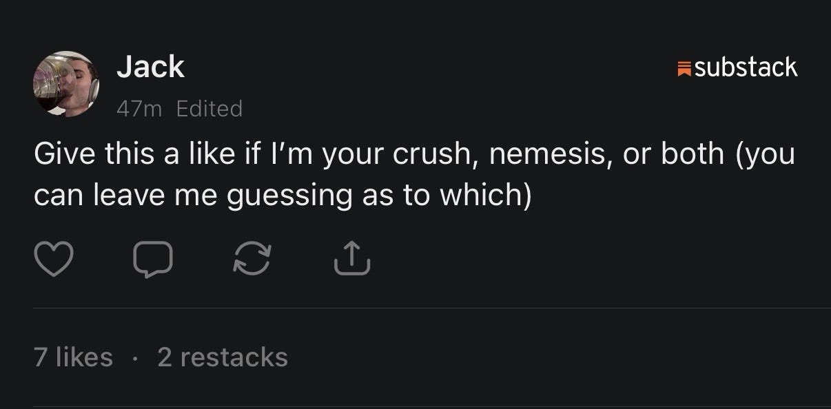 Keep your substack crushes close, and your substack nemeses closer. That’s why, prompted by ✧ brooklyn 𓆏 ‘s note, I had to know:1 who has a crush, and who is a nemesis? So I asked people to like a note if they had a crush or thought they were my nemesis. And then I got to thinking. And then I thought some more. And then I ate a salad. And then all of a sudden I was like wait I wonder what the probability is of me sharing a crush or nemesis status with someone who liked that note? Would my love or hate be requited?