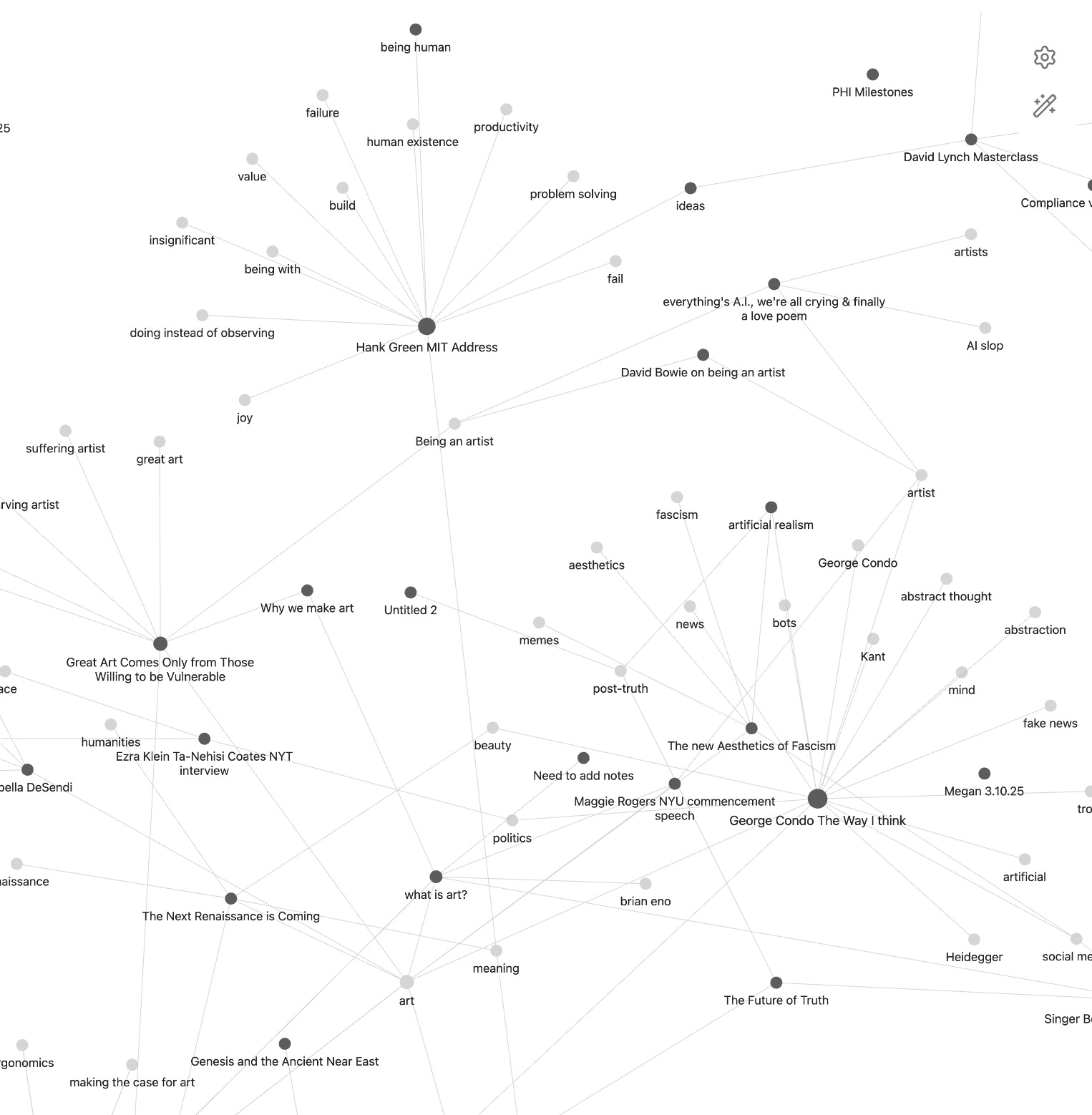 I really like Obsidian for two major reasons: the file sizes are extremely small3 and it’s easy to link elements of a note to another note or broader topic. There are also several options with varying costs for syncing notes across devices, including DIY for free. You can use a double bracket to “highlight” a word or phrase, and that becomes a node in your notes graph. If a note with a title matching exactly what you highlighted exists, it’ll link directly to that. A very basic example of how I use this could be having highlighted [[surrealism]] in multiple individual notes, and then the actual note called “surrealism” would link to those notes; then I might write some specific ideas related to surrealism4 down in that note or include links to other related topics. All of that feeds into a network that obsidian automatically generates, letting you see and search relationships between topics. Below is an example—nodes are tagged words/phrases, and if it’s dark it’s also the title of an already existing note.