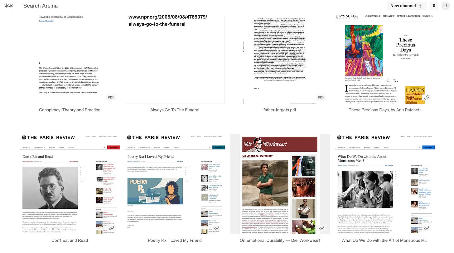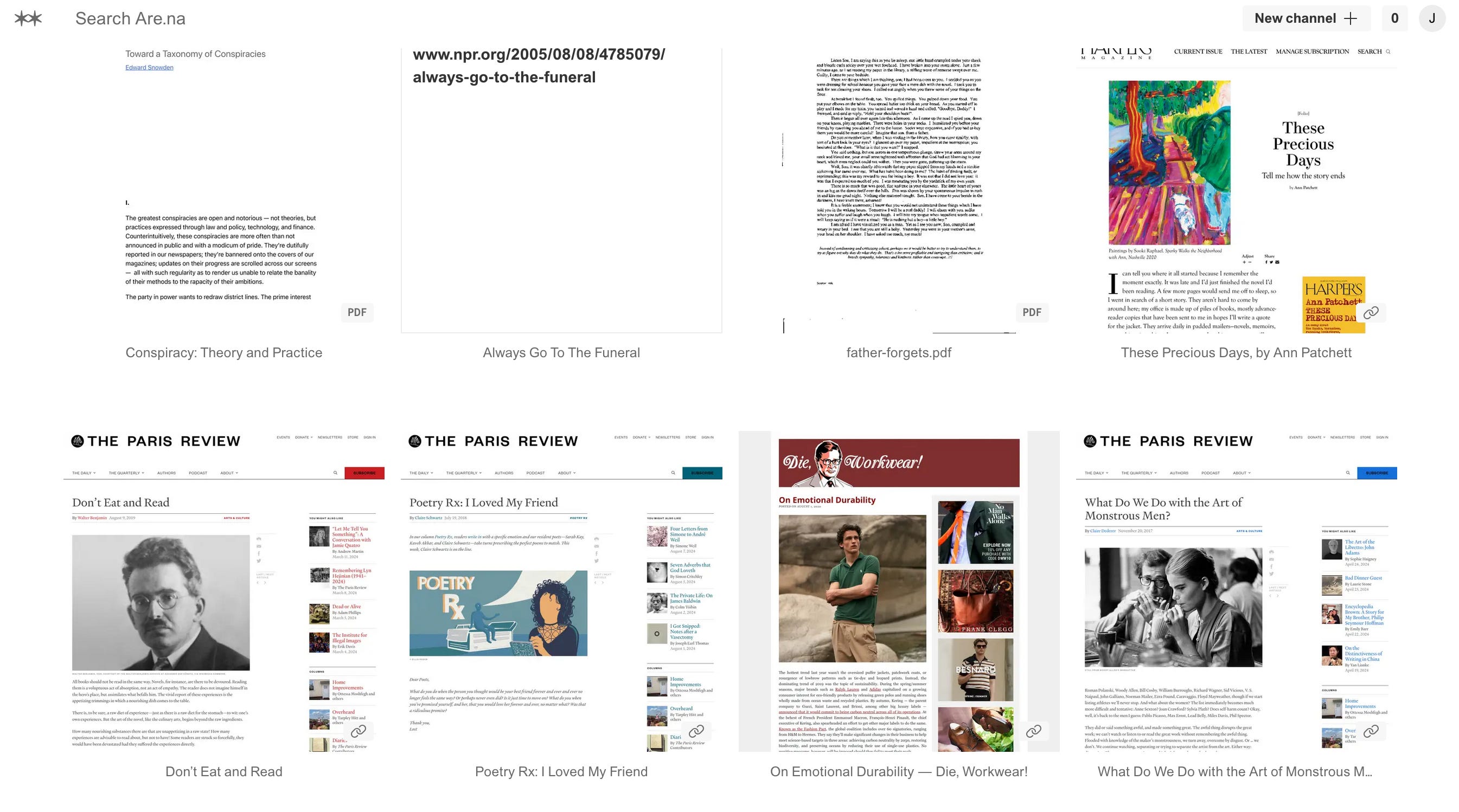 Ultimately what matters most is that you find a system that lets you store ideas, no matter how simple or messy, so that you won’t lose them forever. Bonus points if it’s easy to back up. Often when I’m busy or exhausted I forsake well linked obsidian notes and some of my are.na channels are still a mess,7 but I don’t really care because I know I haven’t lost it forever.