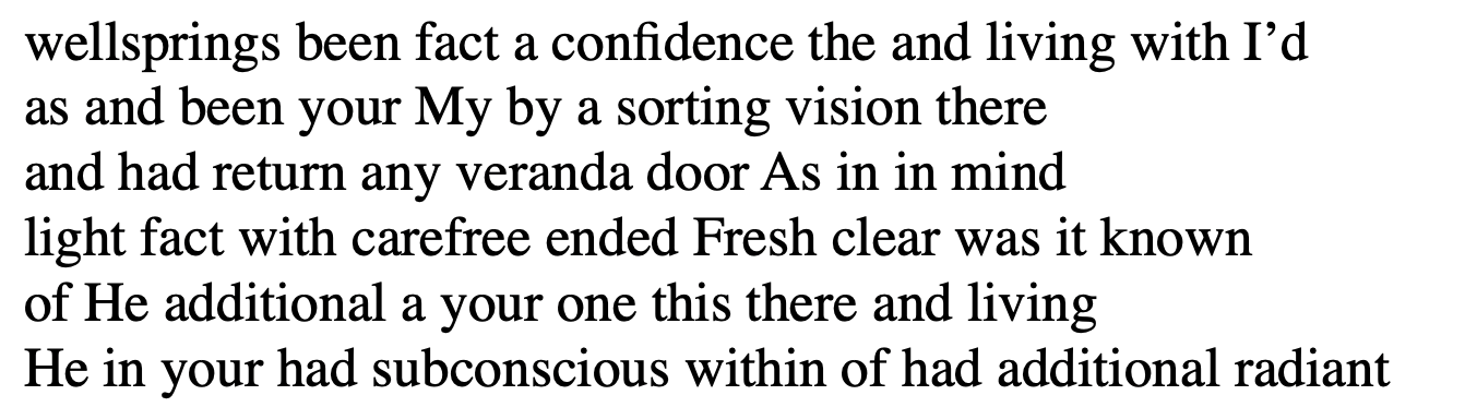 And because I’ve been on an experimental poetry spree, I decided to experiment with some erasure-esque poems (I did a similar one here). To make this poem, I generated six lines with ten words each, and then selected removed (“erase”) some of them to generate the final poem! I’ve been rewatching twin peaks this month, so for the input text I used the transcript of Major Briggs describing his vision to his son.